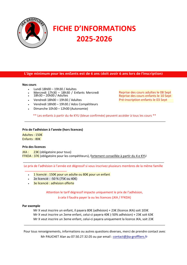 Informations reprises des cours de karaté pour la saison 2025-2026 à JKA Groffliers ICI